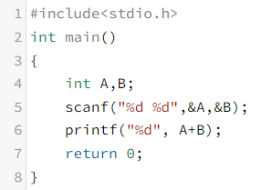 두 정수를 입력 받기 위한 scanf함수의 존재와 입력받은 정수를 더하기 위한 연산자의 활용