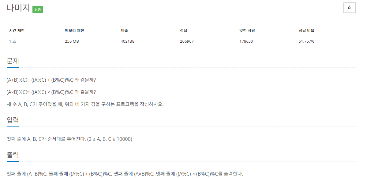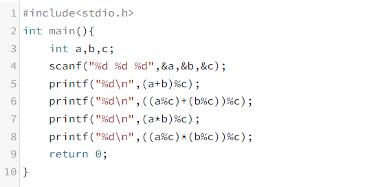 " 순서대로 A,B,C를 입력받았을때 첫째 줄에 (A+B)%C, 둘째 줄에 ((A%C) + (B%C))%C,