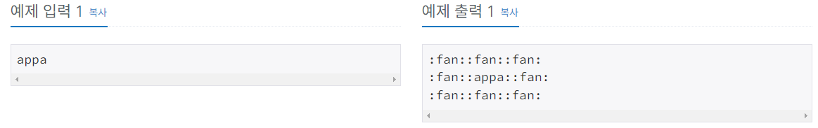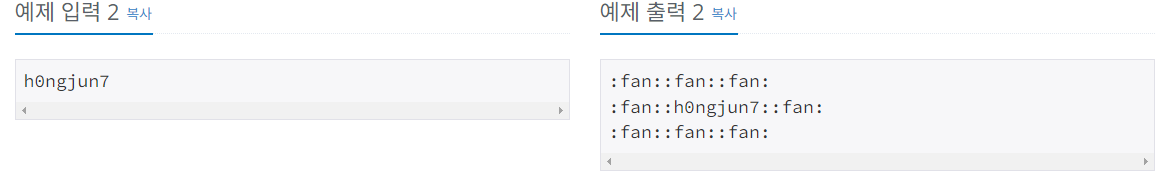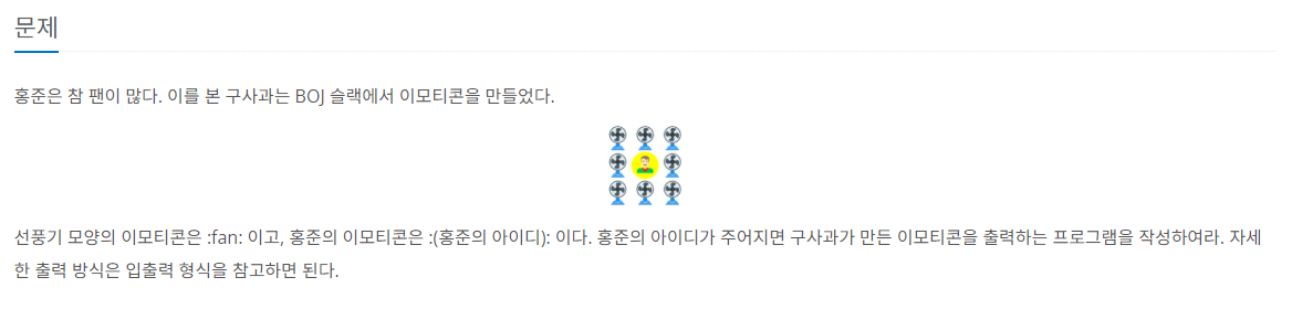 "홍준의 아이디를 입력받고, 그 주위에 :fan:으로 둘러 싸인 상태로 출력하라!