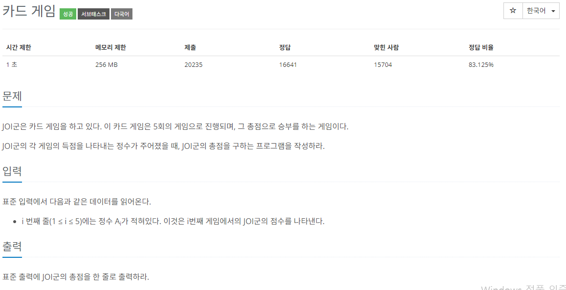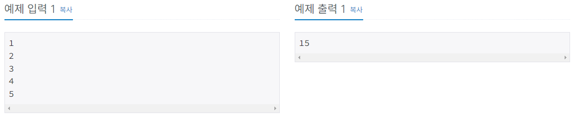 입력받은 다섯개의 수의 총합만 구하기 위한 연산자만 알고 있으면 쉽게 해결할 수 있는 문제다.