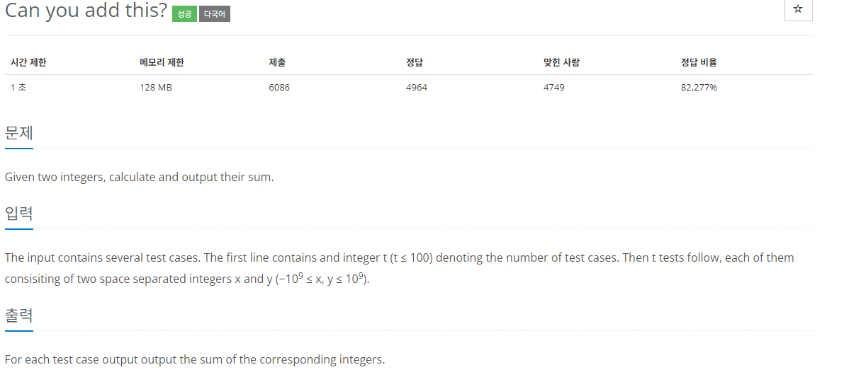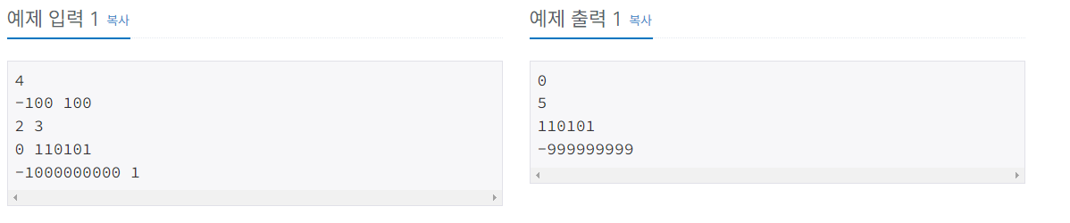 각각은 공백으로 구분된 두 개의 정수 x와 y(−10의 9승 ≤ x, y ≤ 10의9승)으로 구성됩니다.