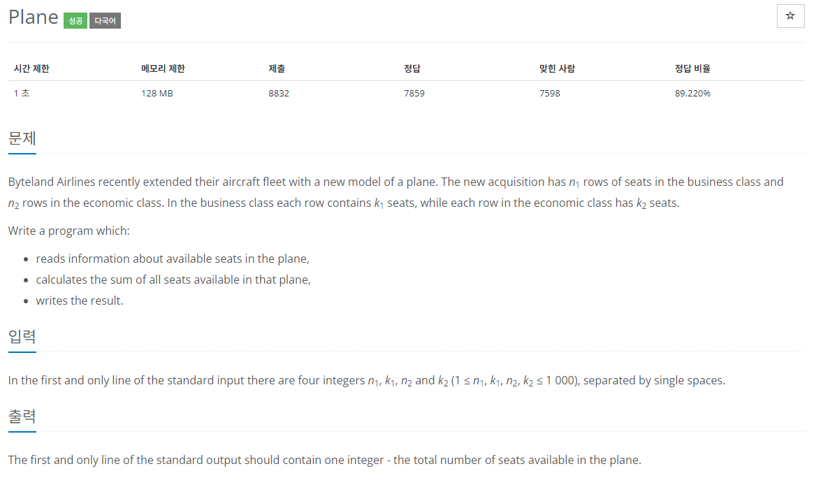 표준 출력의 첫 번째이자 유일한 줄에는 하나의 정수(비행기에서 사용 가능한 총 좌석 수)가 포함되어야 합니다.