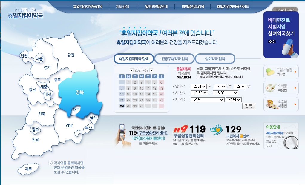 약국 찾는 방법으로 날짜, 시간, 지역 등으로 검색하는 방법과 지도 검색하는 방법으로 찾을 수 있습니다.